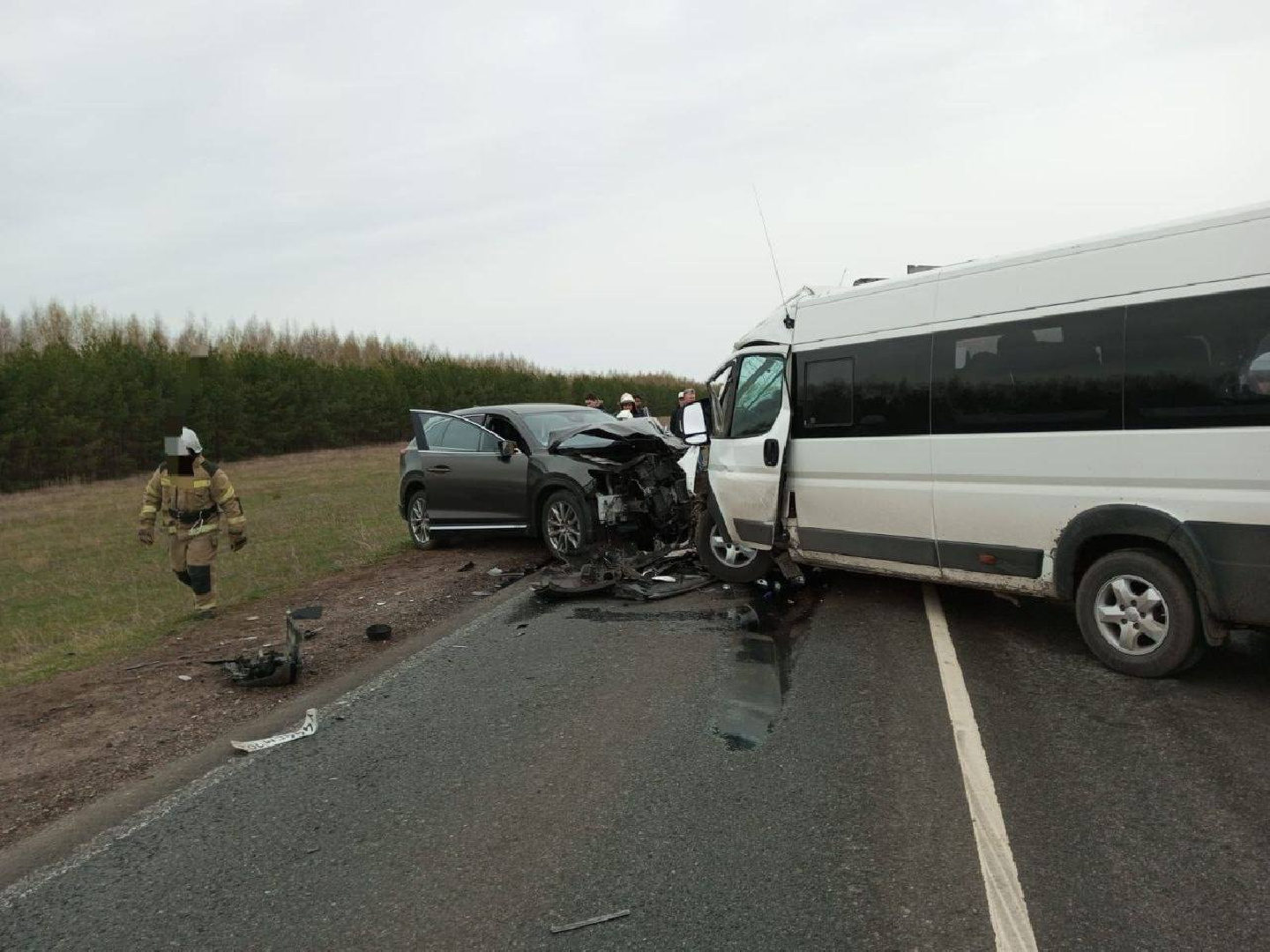 Сообщается, что авария произошла на трассе Нефтекамск-Дюртюли. Кроссовер Мазда столкнулся с микроавтобусом Рено, в салоне которого находились 14 человек. 10 из них увезли в больницу. Установлено, что микроавтобус принадлежит частному перевозчику, он вез пассажиров из Уфы в Ижевск.