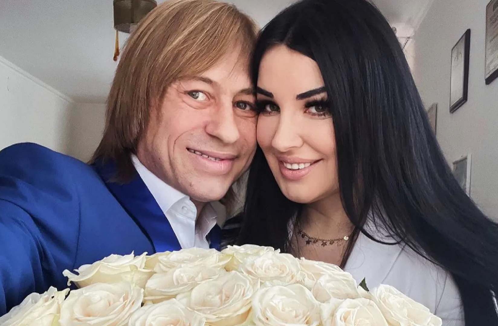 На фотографиях невеста предстала в элегантном белом платье, держа в руках пышный букет белых роз. На одном из снимков новоиспеченные супруги страстно целуются, демонстрируя свидетельство о браке. На другой фотографии они радостно улыбаются в объектив.